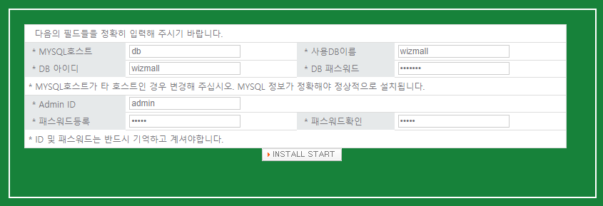 Admin ID 랑 패스워드도 모두 "admin" 이라고 입력해주고, INSTALL START 버튼을 눌러줍니다.