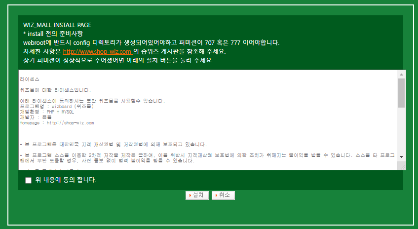 설치가 끝났다면, 마지막 설정 과정이 있는데요. 상호명, 홈페이지명을 wizmall 로 설정해주고, 관리자 이메일은 admin@admin.com 으로 해주고, wizmall 절대경로는 / 으로 설정해줍시다.